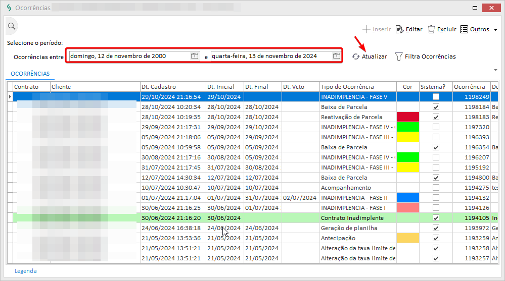 Como excluir uma ocorrência de um contrato, no módulo Carteira de Recebíveis?
