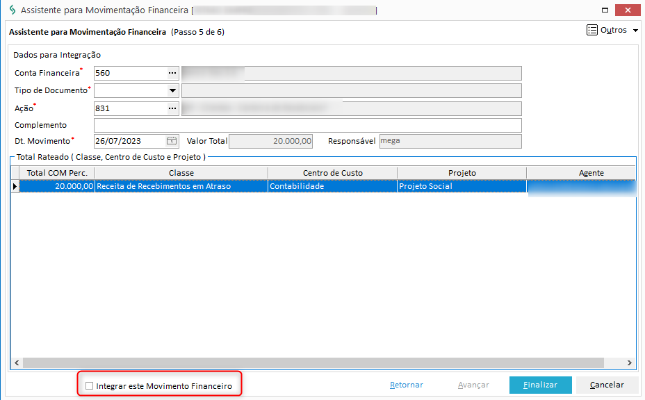 6. Se desejar já integrar o movimento, marque a opção 'Integrar este Movimento Financeiro':