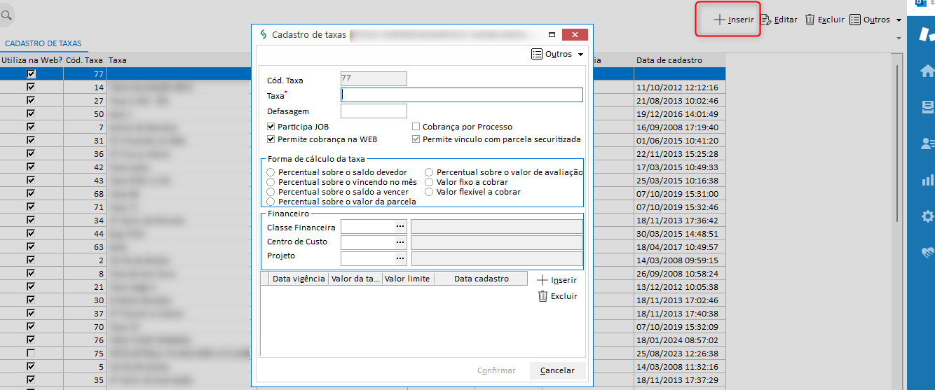 1. Acesse o Construção / Carteira de Recebíveis / Configurações / Taxas Adicionais / Cadastrar;