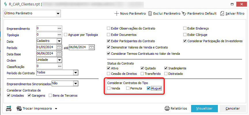 3. No filtro Considerar contratos do Tipo, marque apenas a opção 'Aluguel' e desmarque 'Venda' e 'Permuta':