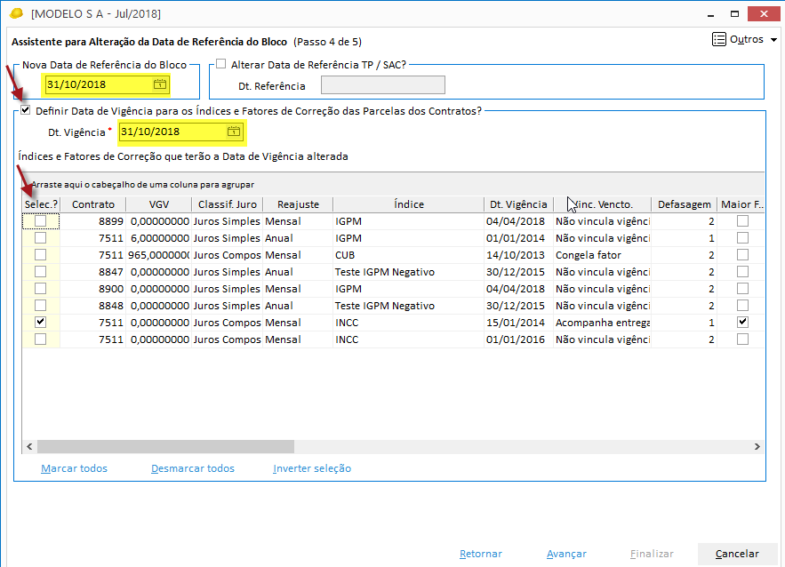 8. Selecione os fatores de correção dos contratos que deseja alterar: