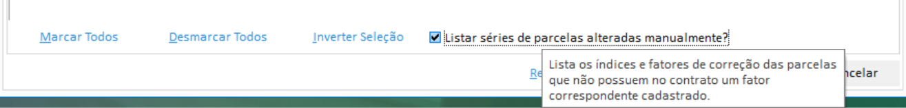 10. Observação: Com o parâmetro: 'Listar séries de parcelas alteradas manualmente' marcado, irá listar os índices e fatores de correção das parcelas que não possuem no contrato um fator correspondente cadastrado.