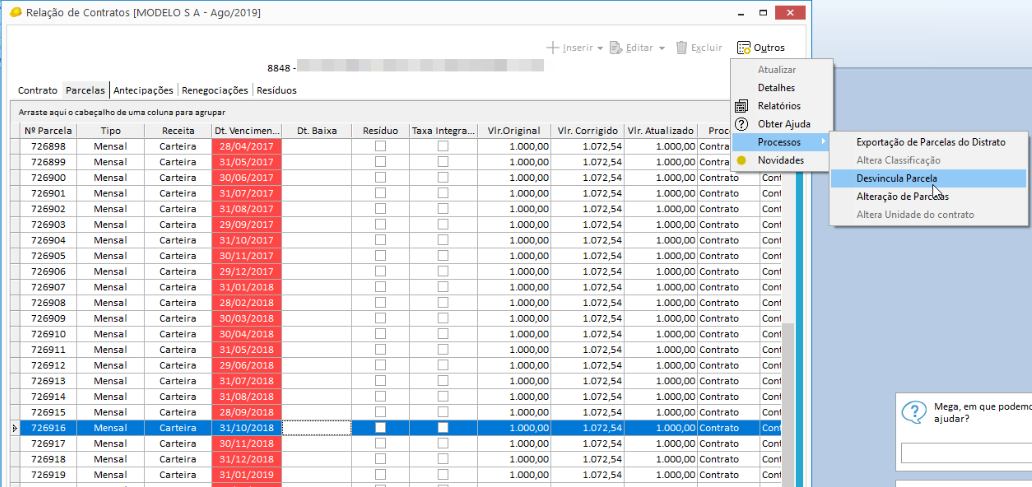 4. Clique no botão Outros / Processos / Desvincula Parcela: