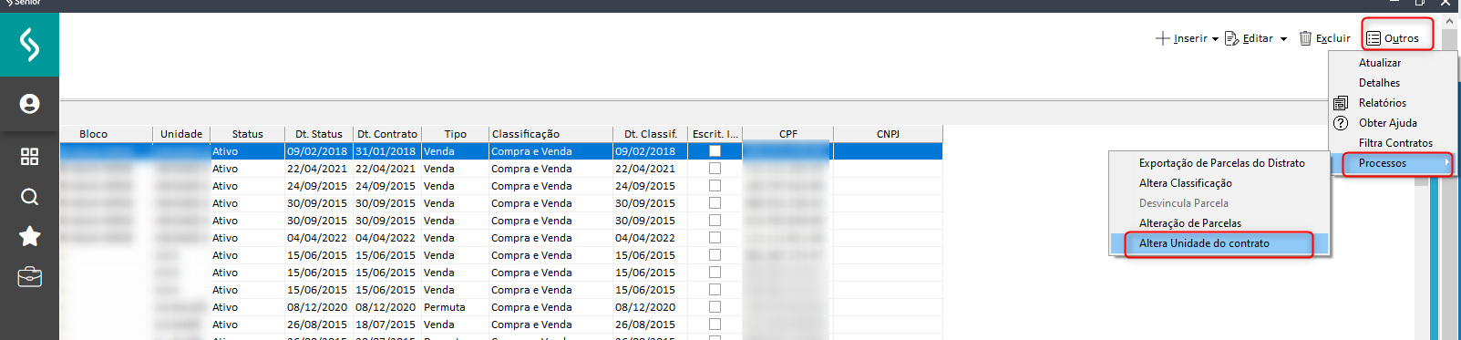 3. Clique no botão Outros / Processos / Altera Unidade do Contrato: