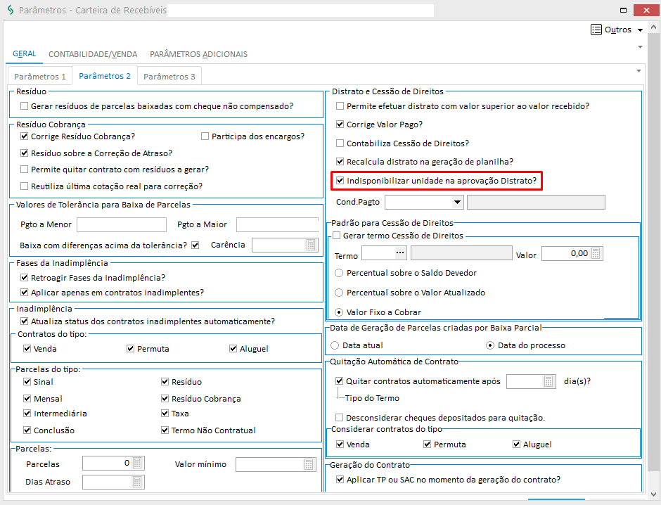2. Na aba Geral, sub aba Parâmetros 2, selecione o parâmetro 'Indisponibilizar unidade na aprovação Distrato?':