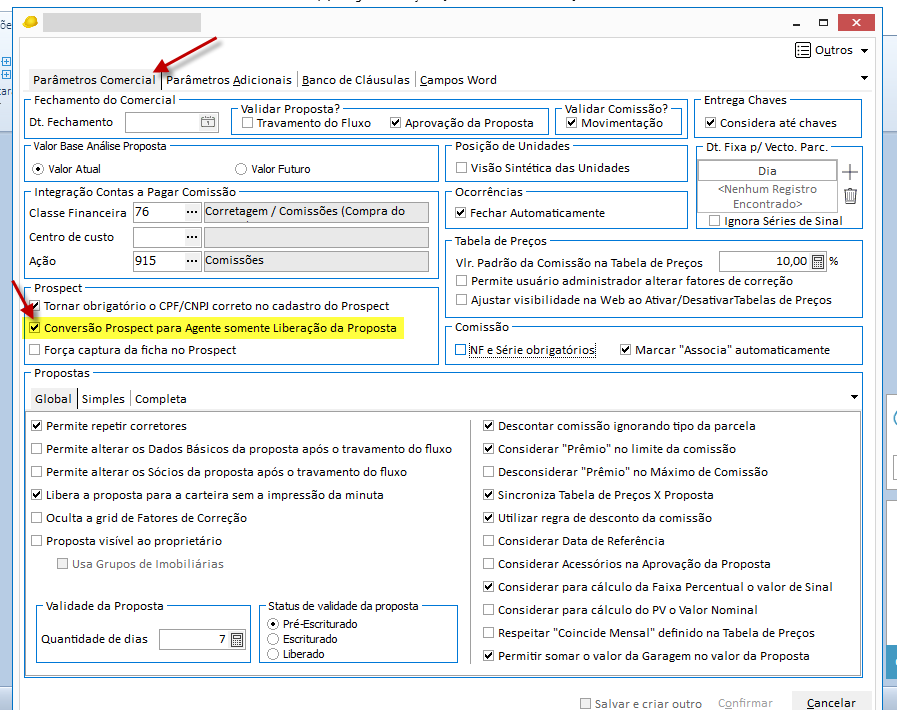 2. Na aba Parâmetro Comercial, selecione a opção 'Conversão Prospect para Agente somente na Liberação da Proposta':