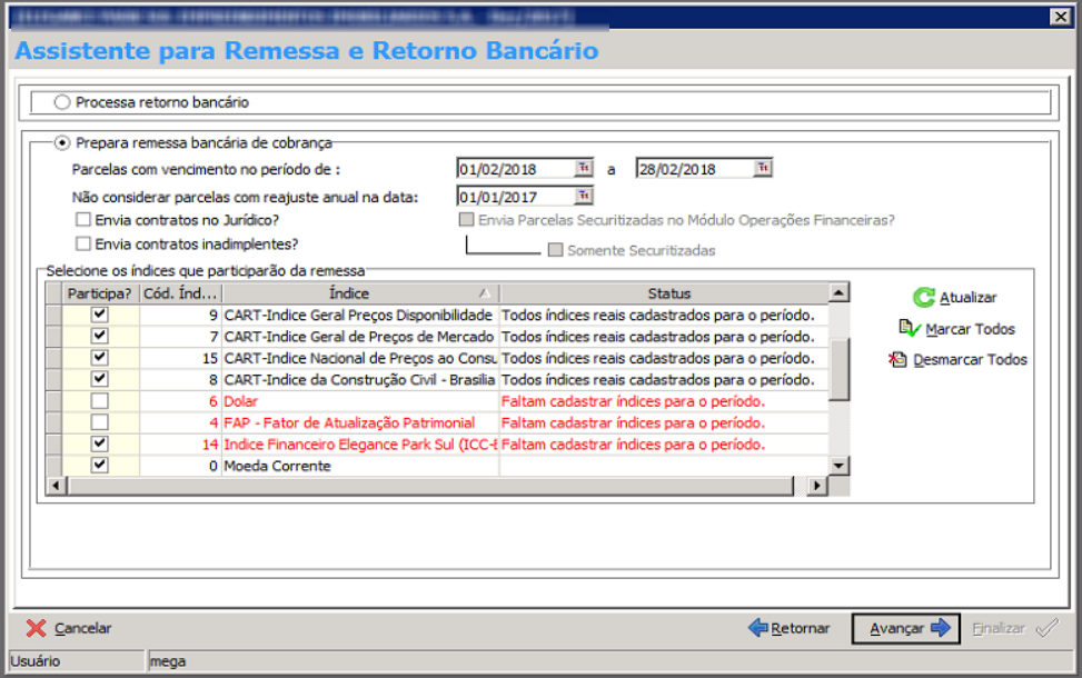 Esse incidente ocorre, pois o Processa Envio e Retorno não está parametrização para considerar contratos no Jurídico e/ou Inadimplentes OU não foi selecionado(s) os índice(s).