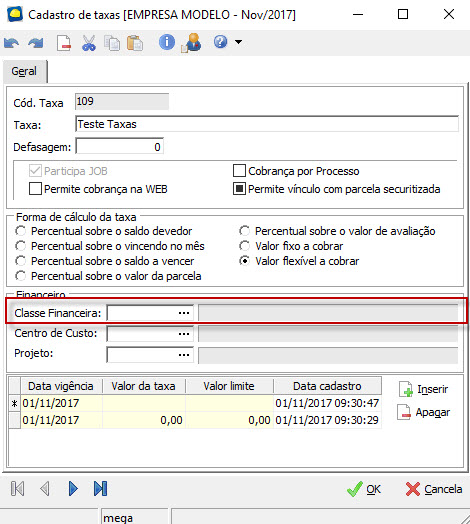 ERP MEGA - Movimentação Financeira - Como configurar a Classe Financeira para parcelas de Taxas Adicionais