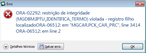 ERP MEGA - ORA-02292: restrição de integridade MGDBM.IPTU_IDENTIFICA_TERMO violada - registro filho localizado ORA-06512: em MGCAR.PCK_CAR_PRC line 3414 ORA-06512: em line 2