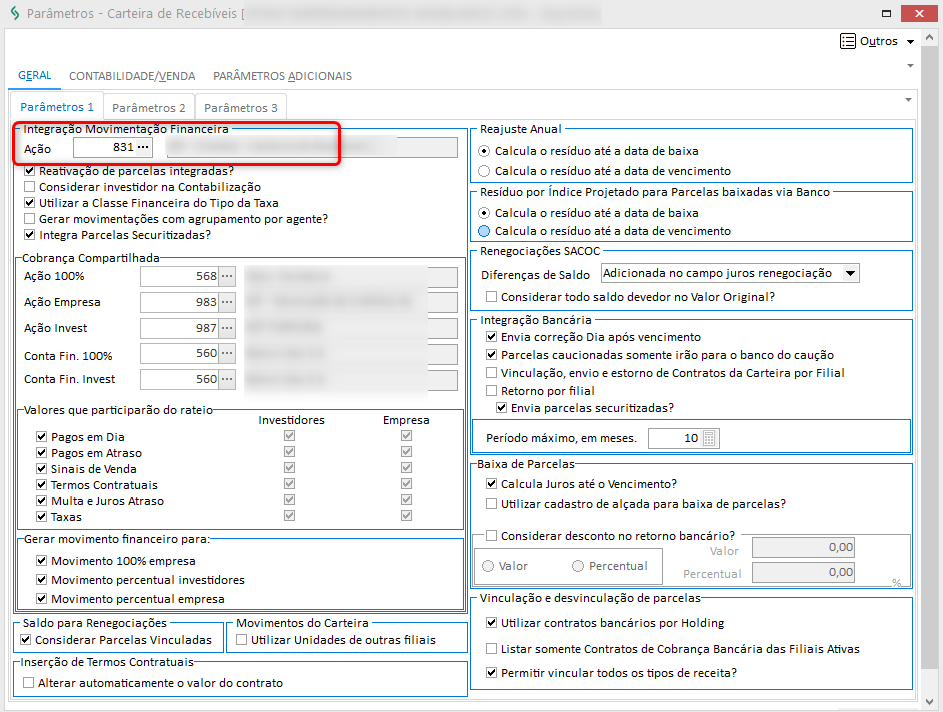 2. Na aba Geral, sub aba Parâmetros 1, no quadro Integração Movimentação Financeira, no campo Ação, selecione o Código de Ação desejado: