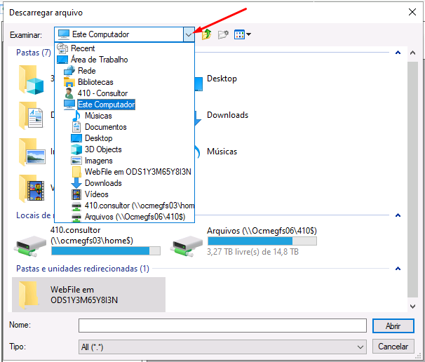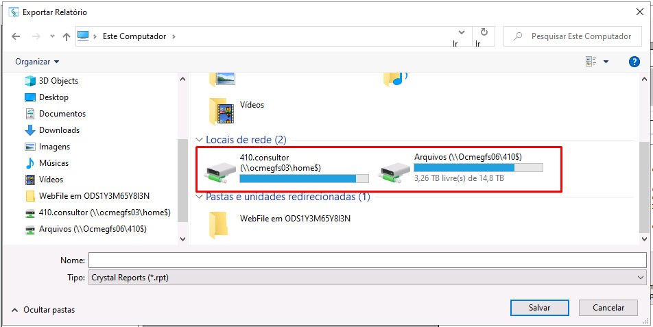 1. Em qualquer tela do sistema que realiza exportação de arquivos, salve o arquivo a ser exportado na unidade U:\Arquivos, ou na unidade H:\SeuUsuário(representado nesse exemplo como '410.consultor') essas unidades sempre estarão disponíveis no Meu Computador: