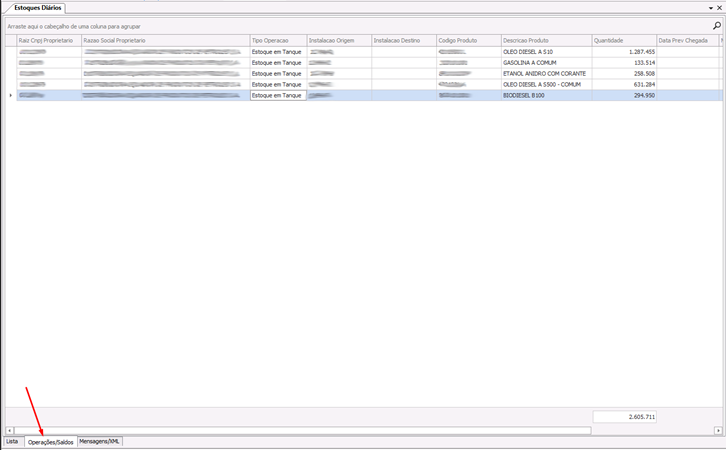 2. Selecione arquivo, na aba Operações/Saldos, você poderá verificar os saldos que foram enviados com o arquivo;