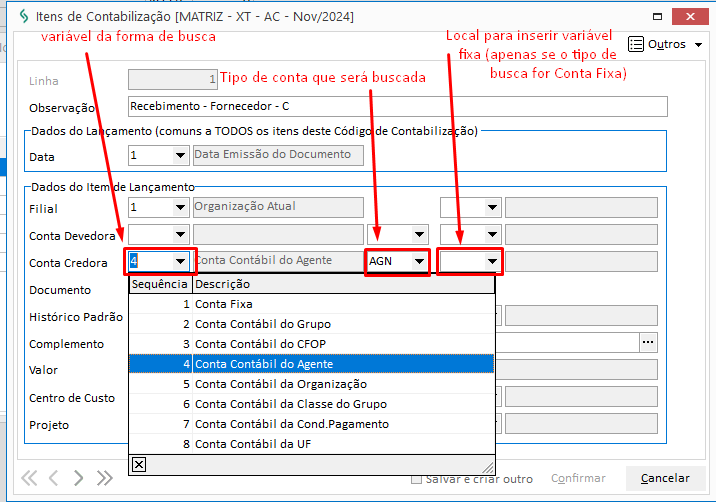 - Conta Contábil do Agente: busca a conta contábil no cadastro do agente usado no lançamento, na aba Contas Contábeis (geralmente são utilizados os tipos de conta AGN e AGNAD);