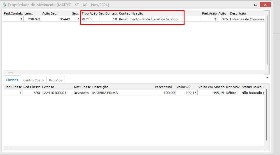 3. Em Propriedade do Movimento, verifique e anote os dados das colunas 'Tipo Ação', 'Seq.Contab.' e 'Contabilização':