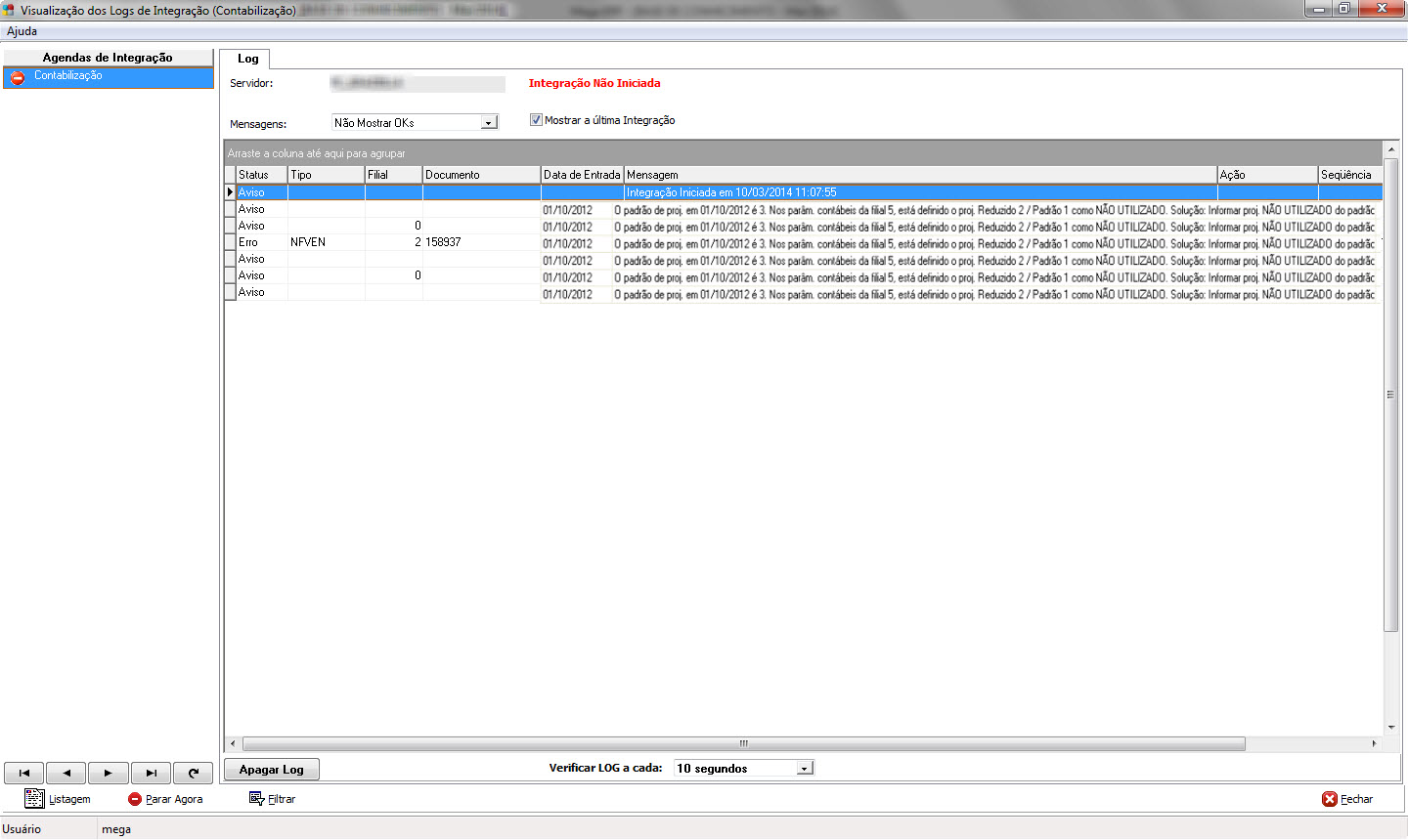 ERP MEGA - Integração Contábil - O padrão de projeto em DD/MM/AAAA é XX. Nos parâmetros contábeis da filial XX, está definido o Padrão XX como Não Utilizado