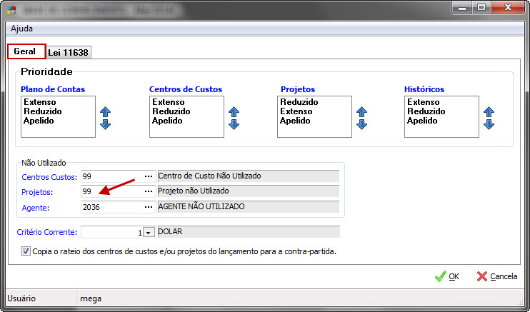 5. Clique na aba Geral e insira o Projeto Não Utilizado: