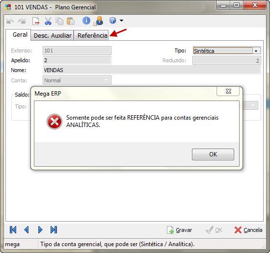 ERP MEGA - Plano Gerencial - Somente pode ser feita referência para contas gerenciais analíticas