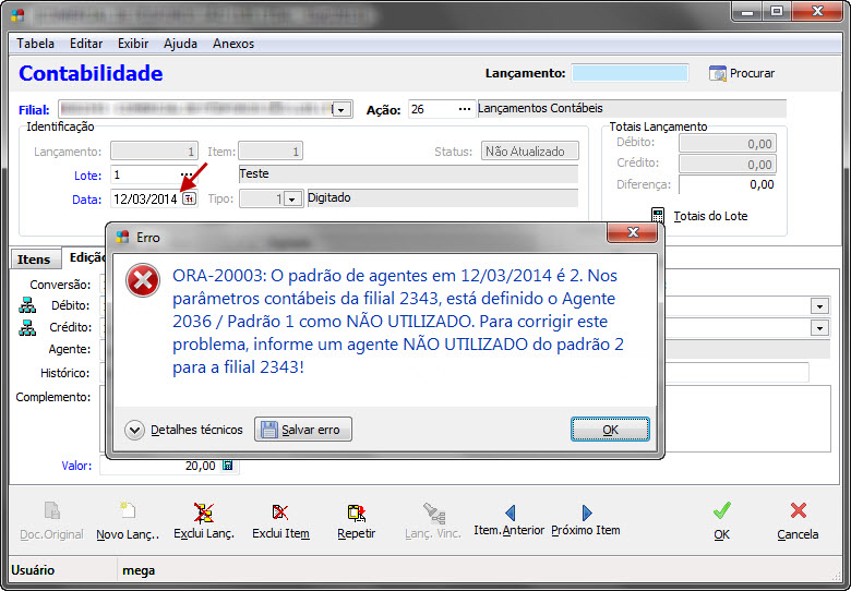 ERP MEGA - Lançamento Contábil - O padrão de agentes em DD/MM/AAAA é XX. Nos parâmetros contábeis da filial XX, está definido o Agente XX/ Padrão XX como Não Utilizado
