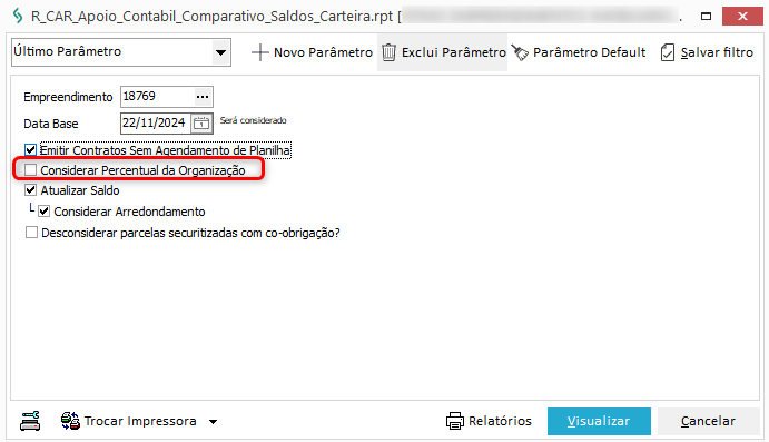 2. Execute o relatório 01) Posição Mensal Comparativa de Saldo (R_CAR_Apoio_Contabil_Comparativo_Saldos_Carteira.rpt) e desmarque o parâmetro 'Considerar Percentual da Organização', no filtro do relatório: