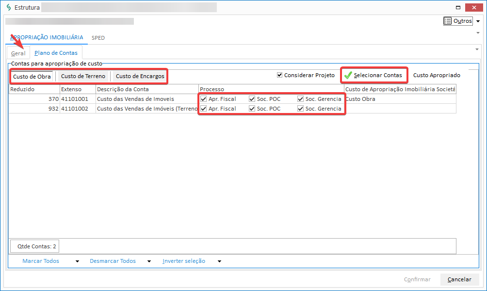 5. Na sub aba Plano de Contas, sub abas Custo de Obra, Custo de Terreno e Custo de Encargos, clique no botão Selecionar Contas e selecione as contas contábeis de custos do empreendimento e marque o tipo de Apropriação que deve utilizá-las:
