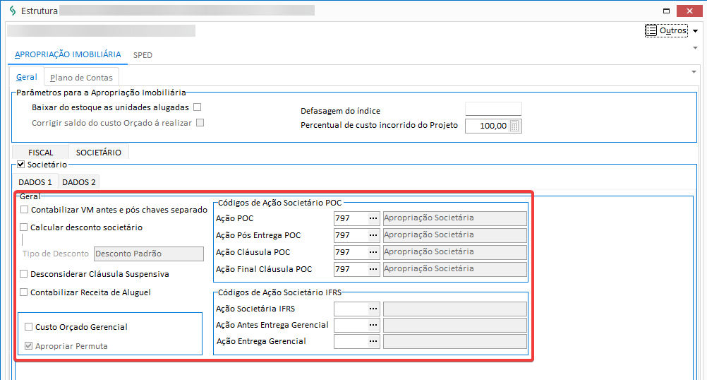 3. Na aba Apropriação Imobiliária, sub aba Geral, sub aba Societário, marque o parâmetro 'Societário';