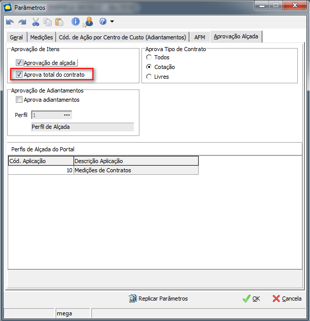 Observação: Desse forma, com o parâmetro marcado a aprovação de alçada levará em conta o valor total do contrato.