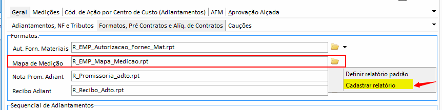 2. Na aba Geral, sub aba Formatos, Pré Contratos e Alíq. de Contratos, no campo Mapa de Medição, clique no ícone e selecione a opção 'Cadastrar Relatório':