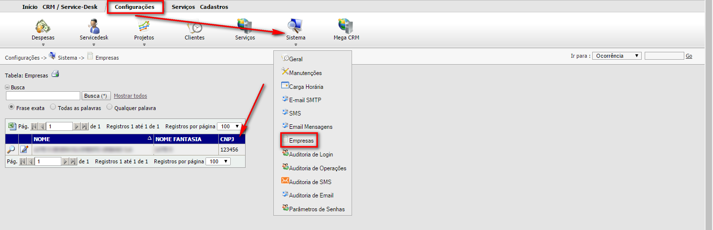 2. Em seguida clique na aba Configurações / Sistemas / Empresas;