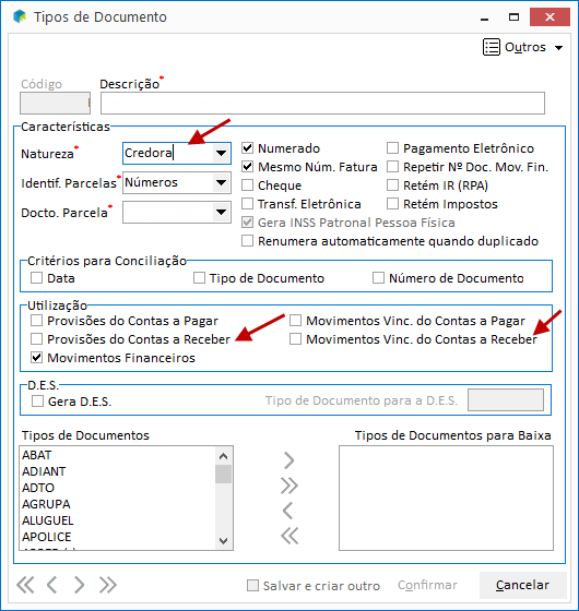 6. Acesse o módulo Financeiro / Opções / Cadastros / Tipos de Documentos;