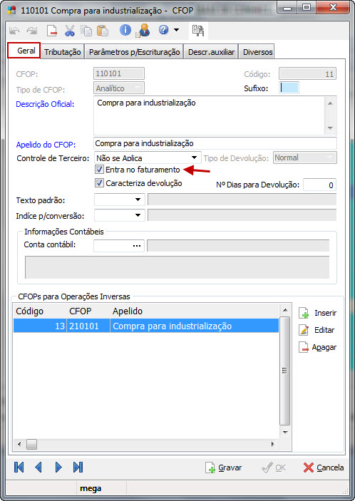4. Verifique se a opção 'Entra no faturamento' está marcada: