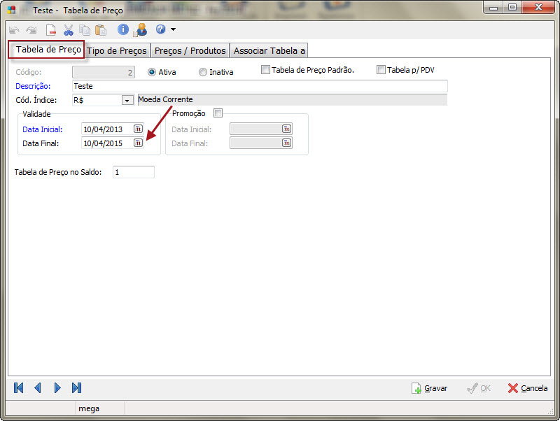 3. Na aba Tabela de Preço, verifique se o pedido foi lançado com a data dentro do período informado no campo 'Data Final';