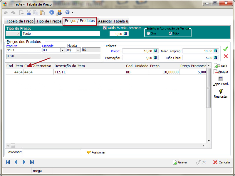 4. Após essa verificação, confirme na aba Preços/Produtos se o item faz parte dessa tabela de preço através do campo Cod. Item.