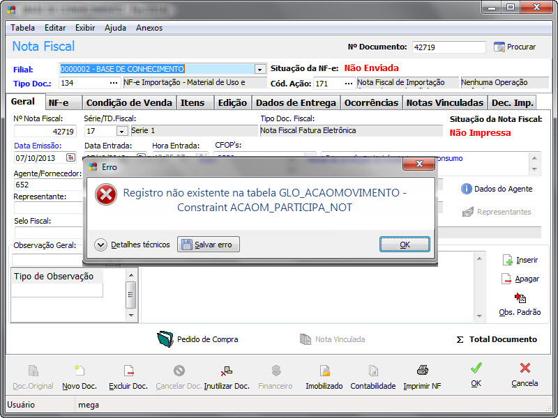 ERP MEGA - Inutilizar Nota de Importação - Registro não existente na tabela GLO_ACAOMOVIMENTO - Constraint ACAOM_PARTICIPA_NOT