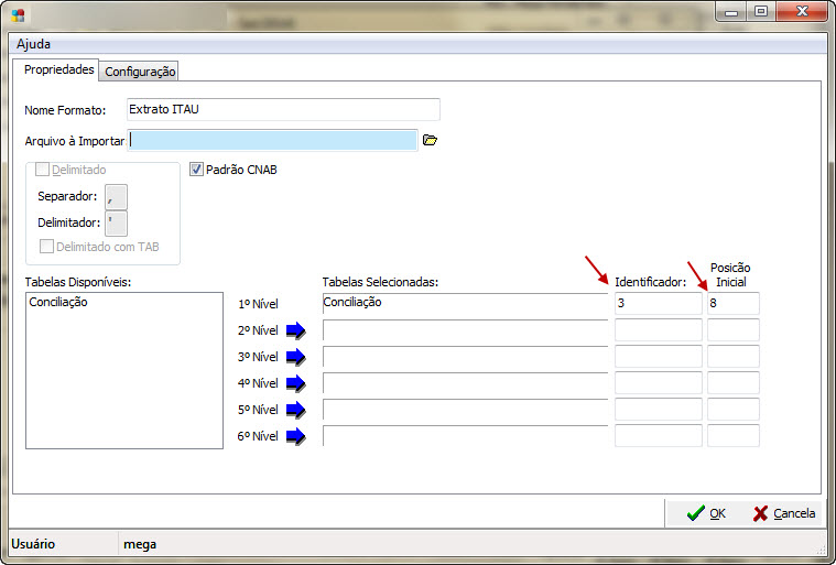 3. Na aba Propriedades, na coluna Identificador, verifique o identificador responsável pela leitura do extrato no arquivo. Na coluna Posição Inicial, identifique a posição do identificador: