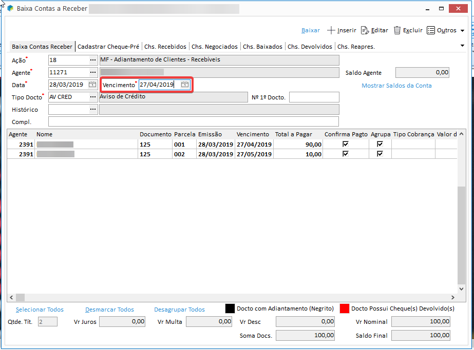 ERP MEGA - Baixa no Contas a Receber - Data de vencimento XX/XX/XXXX não pode ser menor que a data de emissão XX/XX/XXX do documento