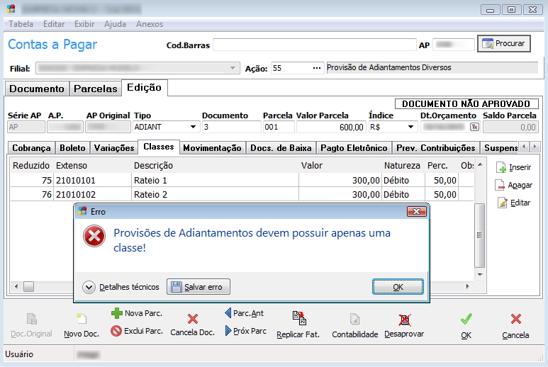 Ao lançar no Contas a Pagar um documento de provisão de adiantamento com mais de uma classe financeira, é apresentado a mensagem: Provisões de Adiantamentos devem possuir apenas uma classe!!