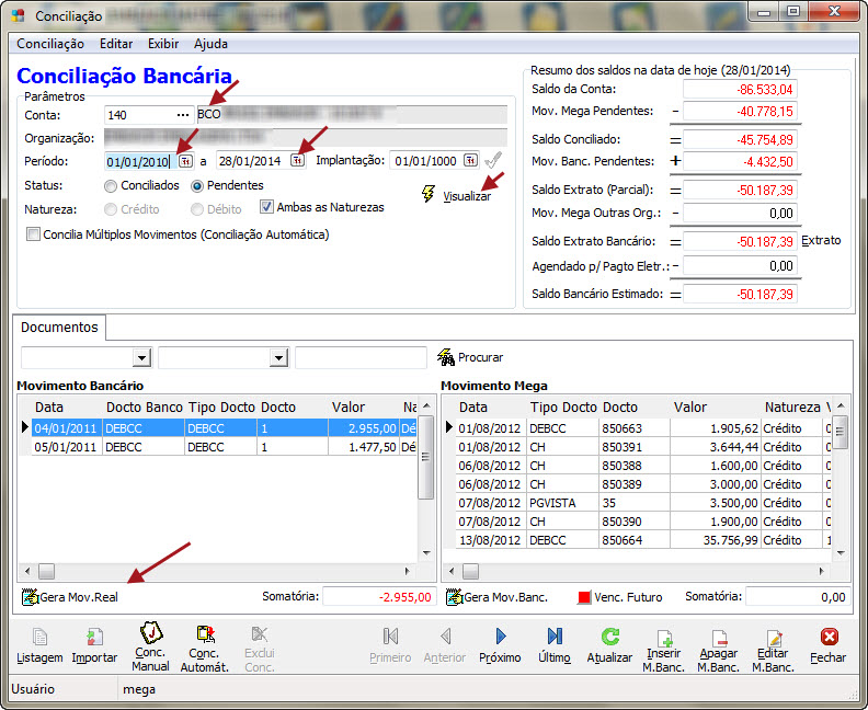 3. Na tela de Conciliação Bancária insira a conta e o período, clique em visualizar e em seguida em Gera Mov. Real: