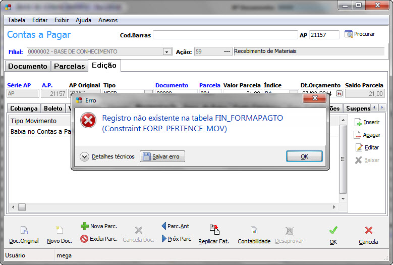 ERP MEGA - Contas a Pagar - Registro não existente na tabela FIN_FORMAPAGTO - Constraint FORP_PERTENCE_MOV
