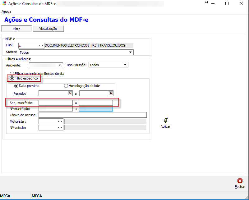 2. No módulo Fretes, acesse MDFe / Processamento, clique em 'Filtro específico', no campo Seq. manifesto, informe o número do manifesto verificado e clique em Aplicar: