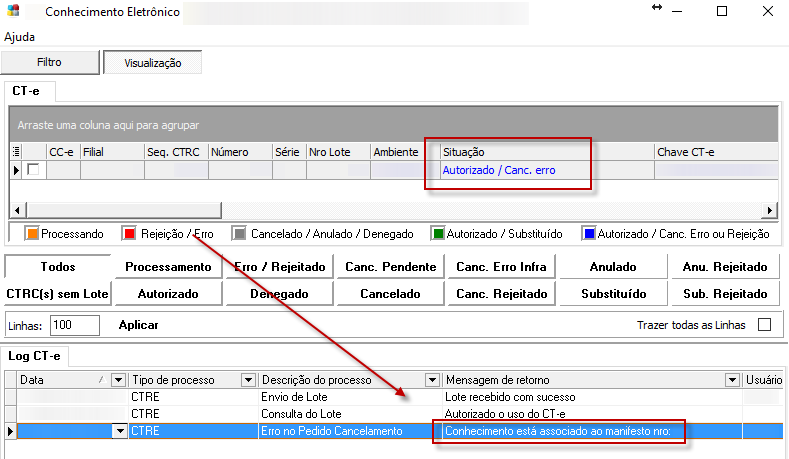 No módulo Fretes, ao realizar o processo de cancelamento de CT-e, o respectivo documento assume situação Autorizado / Canc. Erro e retorna a mensagem: Conhecimento está associado ao manifesto nro: XX.