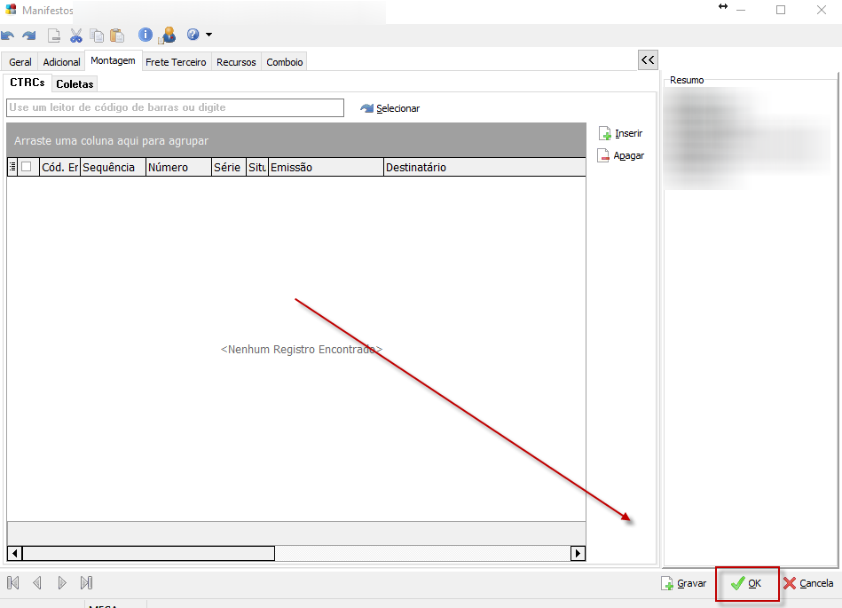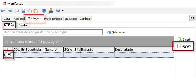 6. Na aba Montagem, sub aba CTRCs, selecione o CT-e e clique em Apagar: