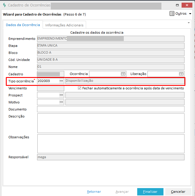 6. No campo Tipo ocorrência, selecione a ocorrência de Disponibilização: