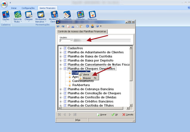 2. Insira o usuário e a partir das opções disponíveis no módulo pode bloquear ou liberar o acesso, para isso basta clicar com botão direito sobre as opções: