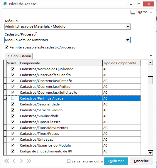 5.3 - Localize a opção 'Cadastros/Perfil de Alçada' e desmarque o checkbox 'Visível' e clique no botão "Confirmar" para salvar as alterações: