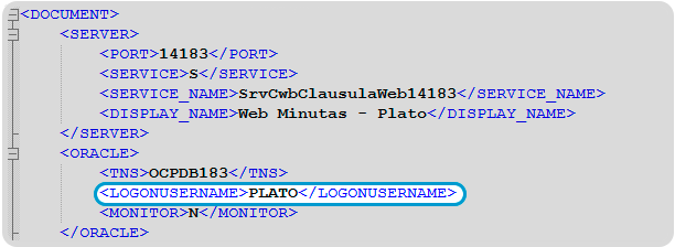 Copie o arquivo PWD do Mega e deixe no mesmo diretório, no qual está localizado o arquivo executável web minutas (SrvWebMinutas.exe). Edite o arquivo “SrvCwbClausulaWeb.xml” e verifique se existe a tag , se não houver crie conforme imagem abaixo. Se estiver comentado, apenas remova o comentário informando o user do banco de dados (Alexandria).