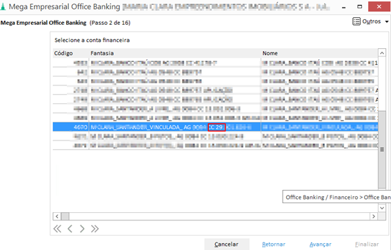 2. Acesse o Módulo Financeiro >> Office Banking e clique em avançar. O Agente Conta Financeira da Conta Corrente se apresentará na listagem, selecione-o e clique em Avançar conforme exemplo abaixo: