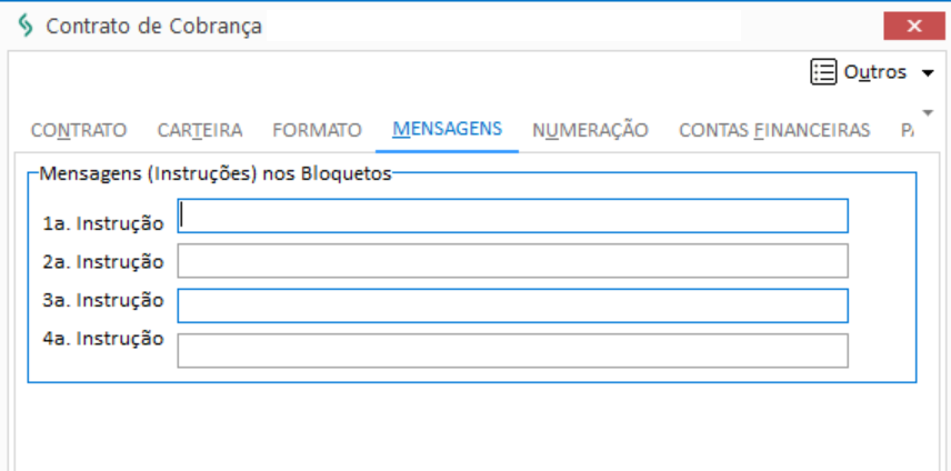 Observação: Para que a aba Mensagens seja apresentada, é necessário que o parâmetro 'Instruções Bloqueto' na aba Carteira esteja marcado.