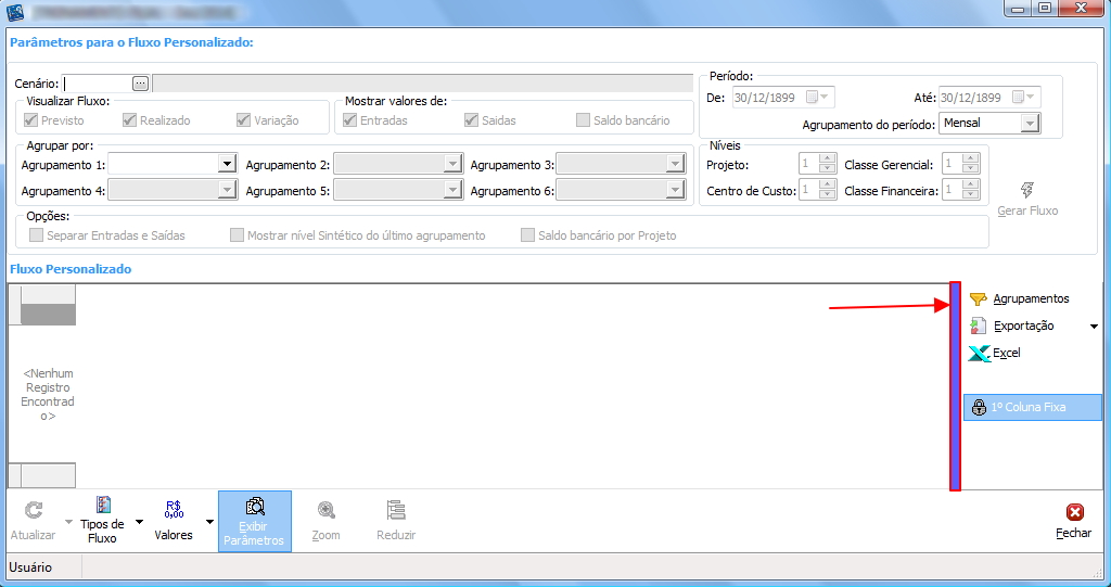 4. Clique no botão EXCEL para gerar o relatório Fluxo_Personalizado.xlt, formatado com tabulação e cabeçalho.