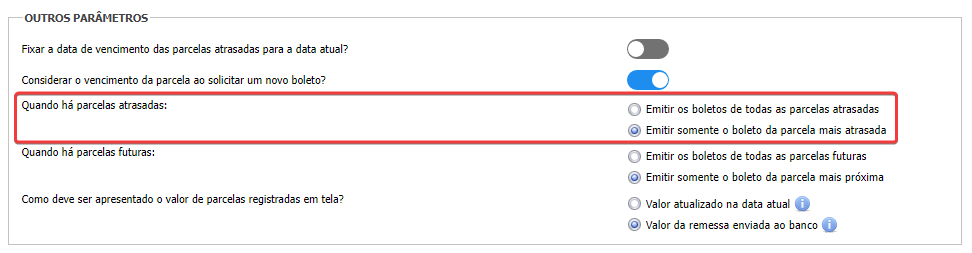 3. Na aba Boleto, localize o quadro Outros Parâmetros e localize o parâmetro 'Quando há parcelas atrasadas:':