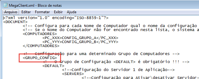 3. Nesse arquivo, localize o node GRUPO_CONFIG, conforme imagem a seguir: